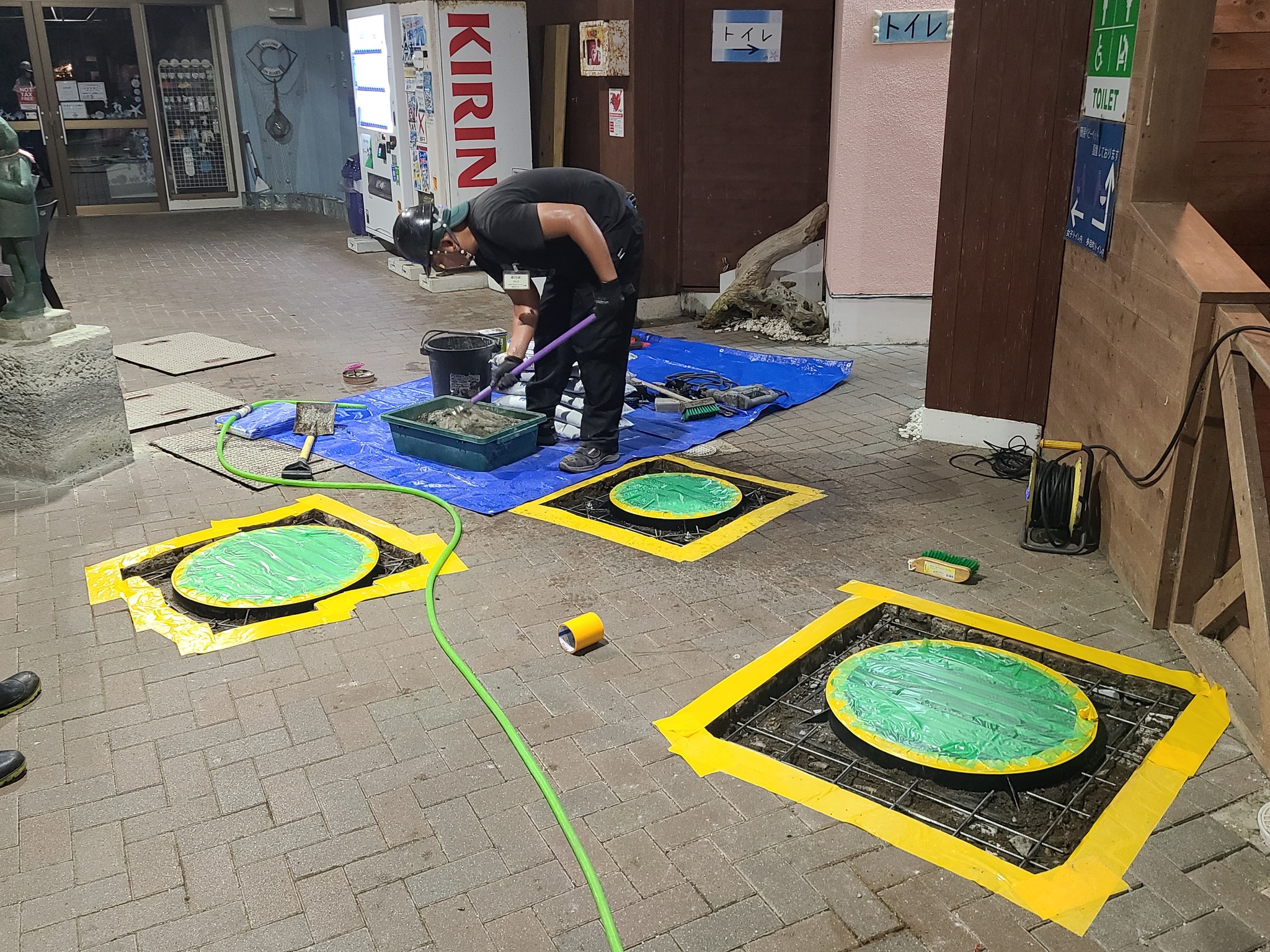 この度、皆様より頂いた支援金にて、うみねCafe~ショップしまたろう間のマンホール(3個)の取り換え工事を行わせていただきました。